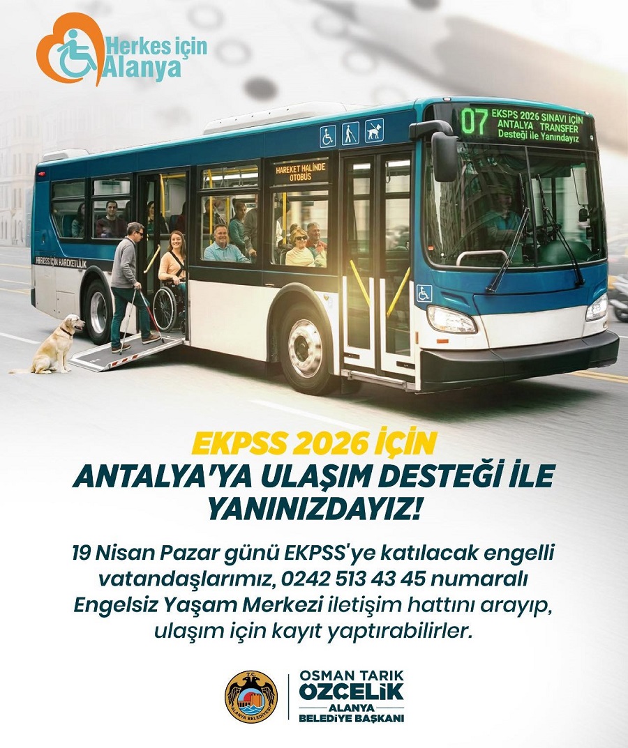 ENGELLİ VATANDAŞLARA KOLAYLIK Alanya Belediyesi, 19 Nisan Pazar günü gerçekleştirilecek EKPSS’ye katılacak engelli vatandaşlar için önemli bir destek sağlıyor. Sınava girecek adaylar, ulaşım konusunda mağduriyet yaşamamaları adına ücretsiz olarak Antalya’ya götürülecek.