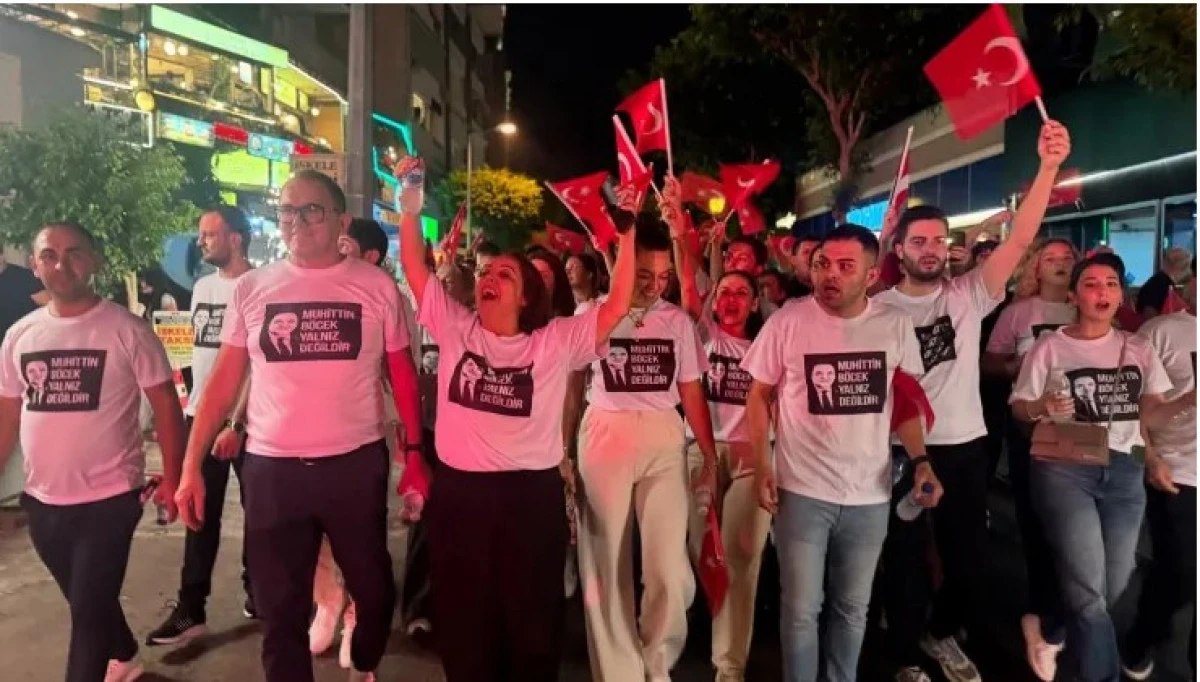 Kutlamalarda, “Muhittin Böcek Yalnız Değildir” yazılı tişörtler giyen ve aynı sloganı atan grup dikkat çekti. Aralarında CHP Parti Meclisi Üyesi Şengül Yeşildal, CHP’nin tanınmış isimlerinden Durmuş Özgen ve CHP Gençlik Kolları Başkanı Mahmuthan Dolapçı’nın da bulunduğu grup, Fener Alayı boyunca bu mesajı verdi.