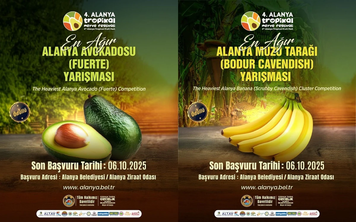 Alanya Belediyesi, 4. Alanya Tropikal Meyve Festivali’nde renkli yarışmalarla vatandaşları bir araya getirmeye hazırlanıyor. Festival kapsamında düzenlenecek “En Ağır Alanya Muzu Tarağı (Bodur Cavendish)”, “En Ağır Alanya Avokadosu (Fuerte)” ve “Nar Ayıklama Yarışması” için başvurular başladı. SON BAŞVURU TARİHİ 6 EKİM Yarışmalara katılmak isteyenler, 6 Ekim 2025 tarihine kadar Alanya Belediyesi veya Alanya Ziraat Odası’na başvuruda bulunabilecek. Festival süresince düzenlenecek etkinliklerde dereceye girenler ödüllendirilecek.
