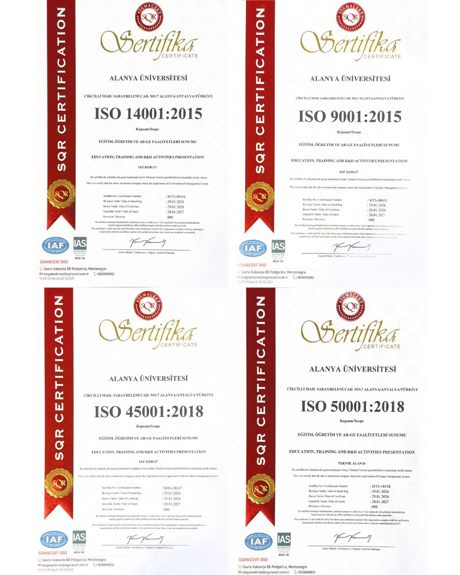 ULUSLARARASI KALİTE TESCİLİ ALDI Alanya Üniversitesi, kurumsal yönetim anlayışını uluslararası standartlarla güçlendirerek kalite, çevre, enerji ve iş sağlığı güvenliği alanlarında dört ayrı ISO belgesi almaya hak kazandı.