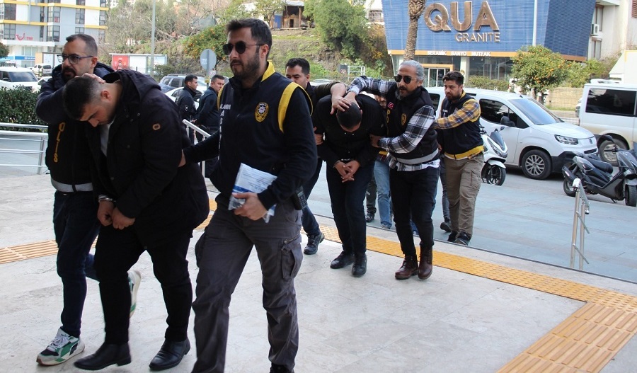 Alanya İlçe Emniyet Müdürlüğü Asayiş Büro Amirliği ekiplerince kısa sürede yakalanarak gözaltına alınan A.D., H.D., A.G., B.G., A.G., A.G. ve H.G. isimli 7 şüpheli, emniyetteki işlemlerinin ardından yoğun güvenlik önlemleri altında Alanya Adliyesi’ne sevk edildi.