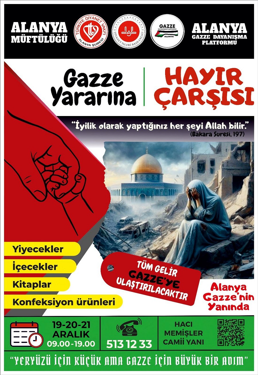 Alanya’da Gazze halkına destek olmak amacıyla anlamlı bir hayır etkinliği düzenleniyor. 19-20-21 Aralık tarihlerinde kurulacak Hayır Çarşısı’ndan elde edilecek tüm gelirin Gazze’ye ulaştırılacağı açıklandı.