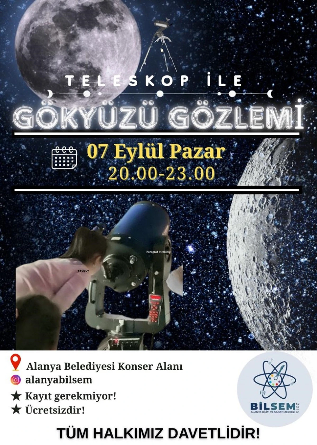 GÖKYÜZÜNÜ KEŞFETMEK İSTEYENLER İÇİN FIRSAT Alanya Bilim ve Sanat Merkezi (BİLSEM), 7 Eylül Pazar günü Alanya Belediyesi Konser Alanı’nda halka açık teleskopla gökyüzü gözlemi etkinliği düzenliyor. Saat 20.00–23.00 arasında gerçekleşecek etkinlikte katılımcılar, uzman eğitmenler eşliğinde Ay’ı, gezegenleri ve gökyüzünün büyüleyici detaylarını yakından inceleyebilecek.