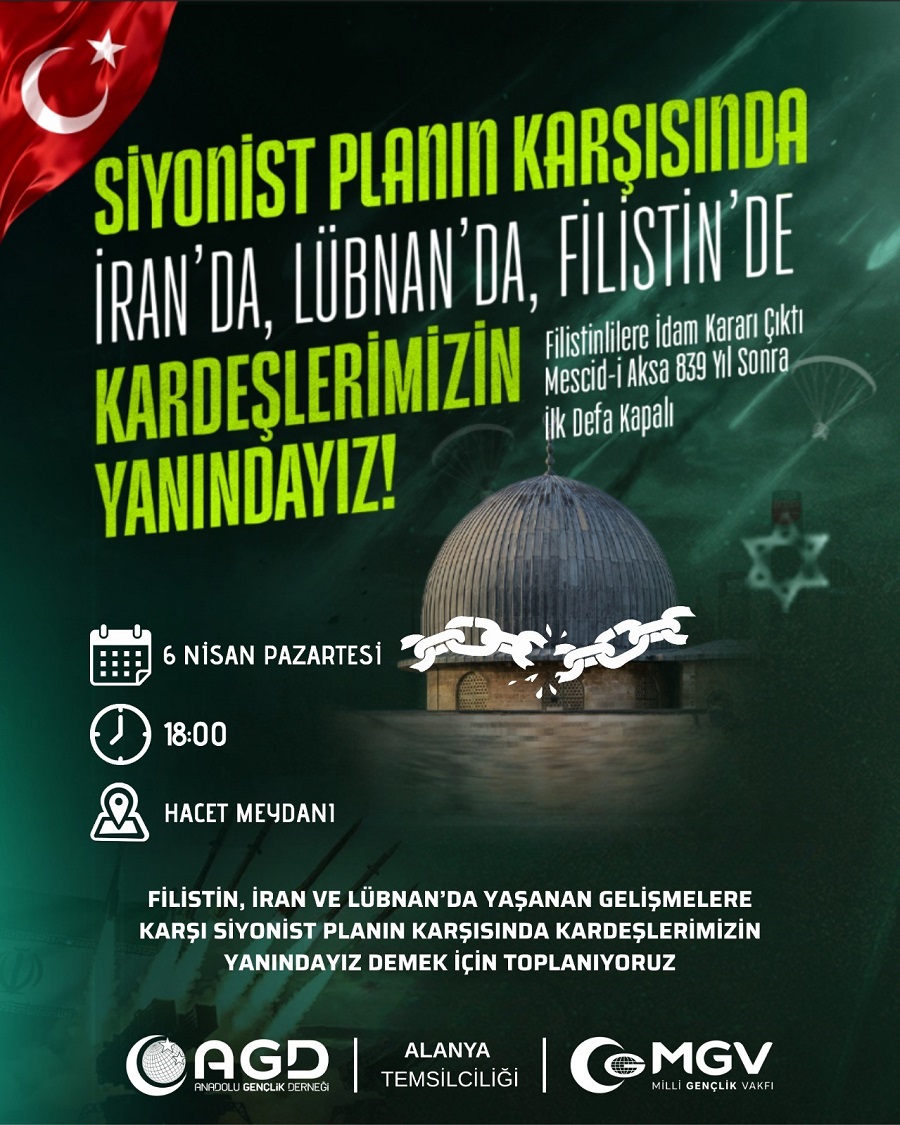 AGD ve MGV tarafından yapılan ortak çağrıda, Filistin, İran ve Lübnan’da yaşanan gelişmelere karşı duyarlılık göstermek isteyen tüm vatandaşlar Hacet Meydanı’na davet edildi. Açıklamada, “Siyonist planın karşısında kardeşlerimizin yanındayız demek için tek yürek olalım” ifadelerine yer verildi.