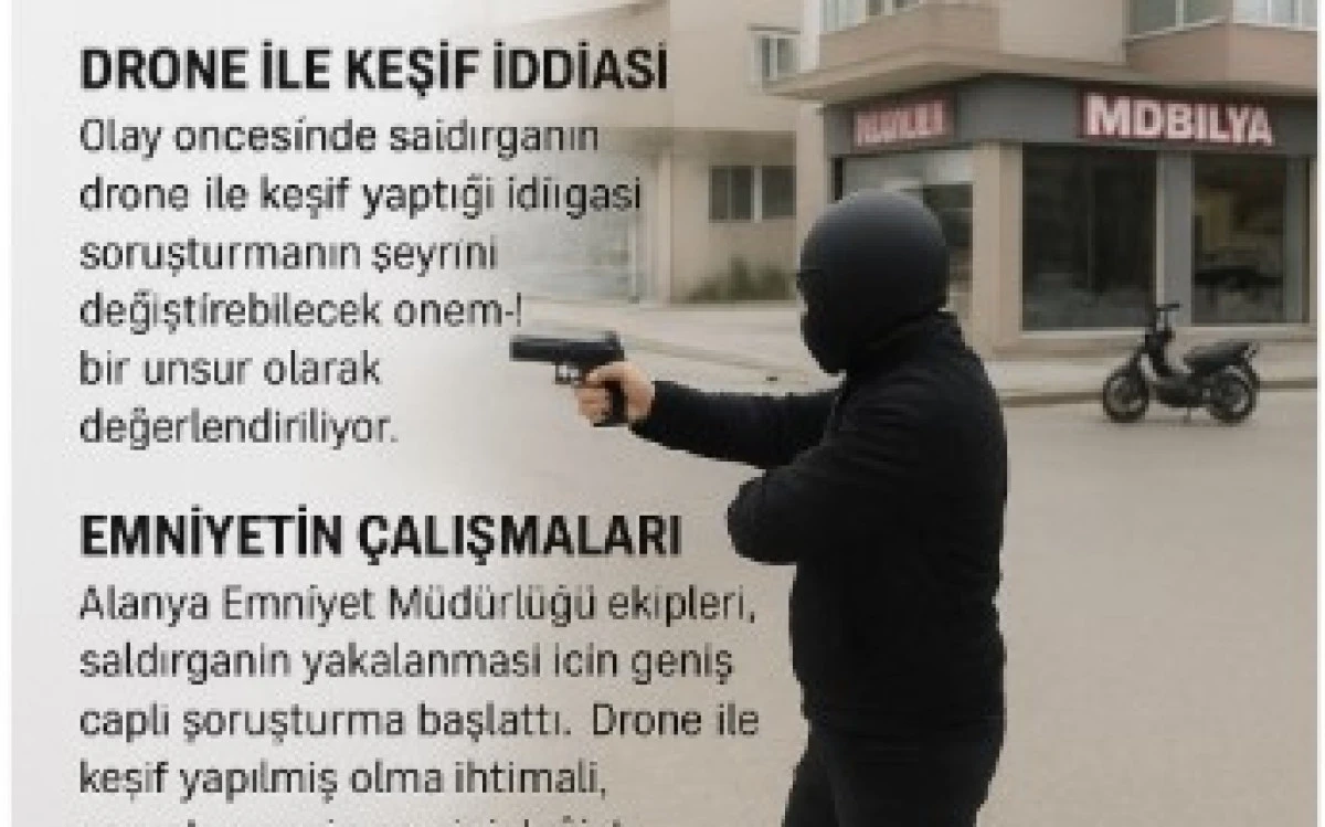 Drone ile Keşif İddiası Soruşturmayı Derinleştirdi Alanya’nın Çıplaklı Mahallesi’nde faaliyet gösteren bir mobilya dükkanında, eski Ülkü Ocakları yöneticisi S.S., silahlı saldırıya uğradı. Görgü tanıklarının ifadelerine göre, saldırgan olaydan önce işyeri üzerinde drone ile keşif yaptı. Bu iddia, saldırının planlı ve organize bir şekilde gerçekleştirildiğine dair şüpheleri artırdı.