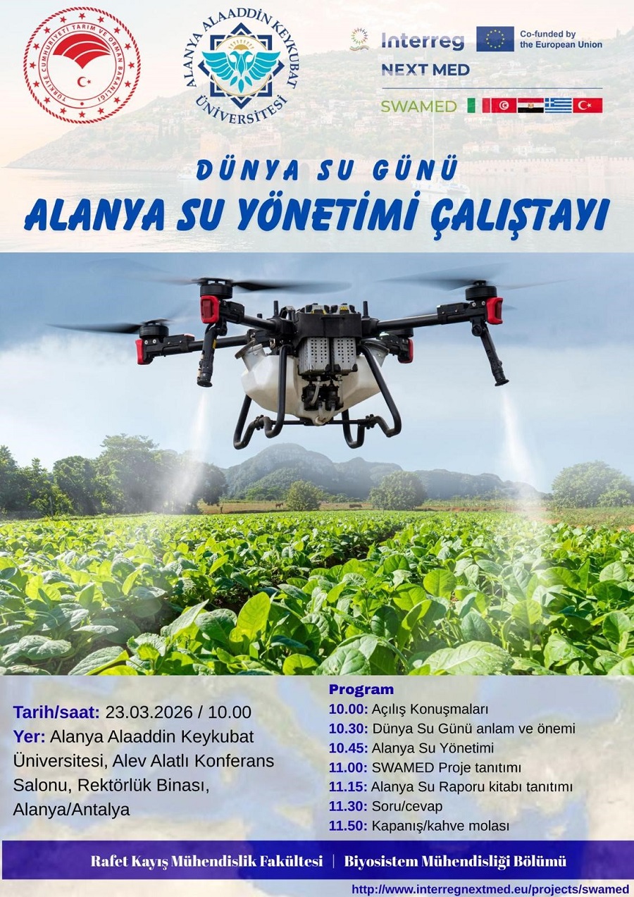 Alanya Alaaddin Keykubat Üniversitesi Rafet Kayış Mühendislik Fakültesi Biyosistem Mühendisliği Bölümü, 22 Mart Dünya Su Günü kapsamında “Dünya Su Günü: Alanya Su Yönetimi Çalıştayı”na ev sahipliği yapıyor. Çalıştay, su kaynaklarının sürdürülebilir yönetimi, çevresel sürdürülebilirlik ve bölgesel su politikalarının ele alınacağı kapsamlı bir programla 23 Mart 2026 Pazartesi günü gerçekleşecek.