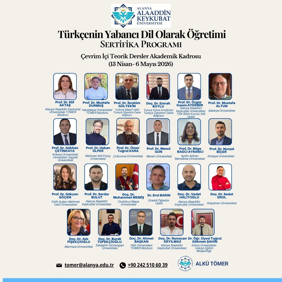 Alanya Alaaddin Keykubat Üniversitesi (ALKÜ) bünyesinde faaliyet gösteren ALKÜ Türkçe ve Yabancı Dil Öğretimi Uygulama ve Araştırma Merkezi (TÖMER) tarafından düzenlenen “Türkçenin Yabancı Dil Olarak Öğretimi Sertifika Programı”, alanında uzman akademisyenlerin katkılarıyla 13 Nisan–6 Mayıs 2026 tarihleri arasında çevrim içi olarak gerçekleştirilecek.