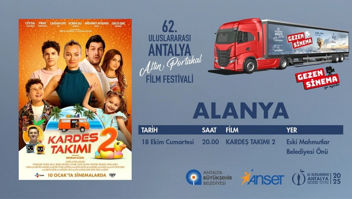 Türkiye’nin en köklü sinema etkinliği olan Altın Portakal Film Festivali’nin sıcak atmosferi bu yıl da “Gezen Sinema” ile şehre yayılıyor. Etkinlik kapsamında Alanya Mahmutlar Mahallesi Eski Belediye Binası önünde film gösterimi yapılacak.