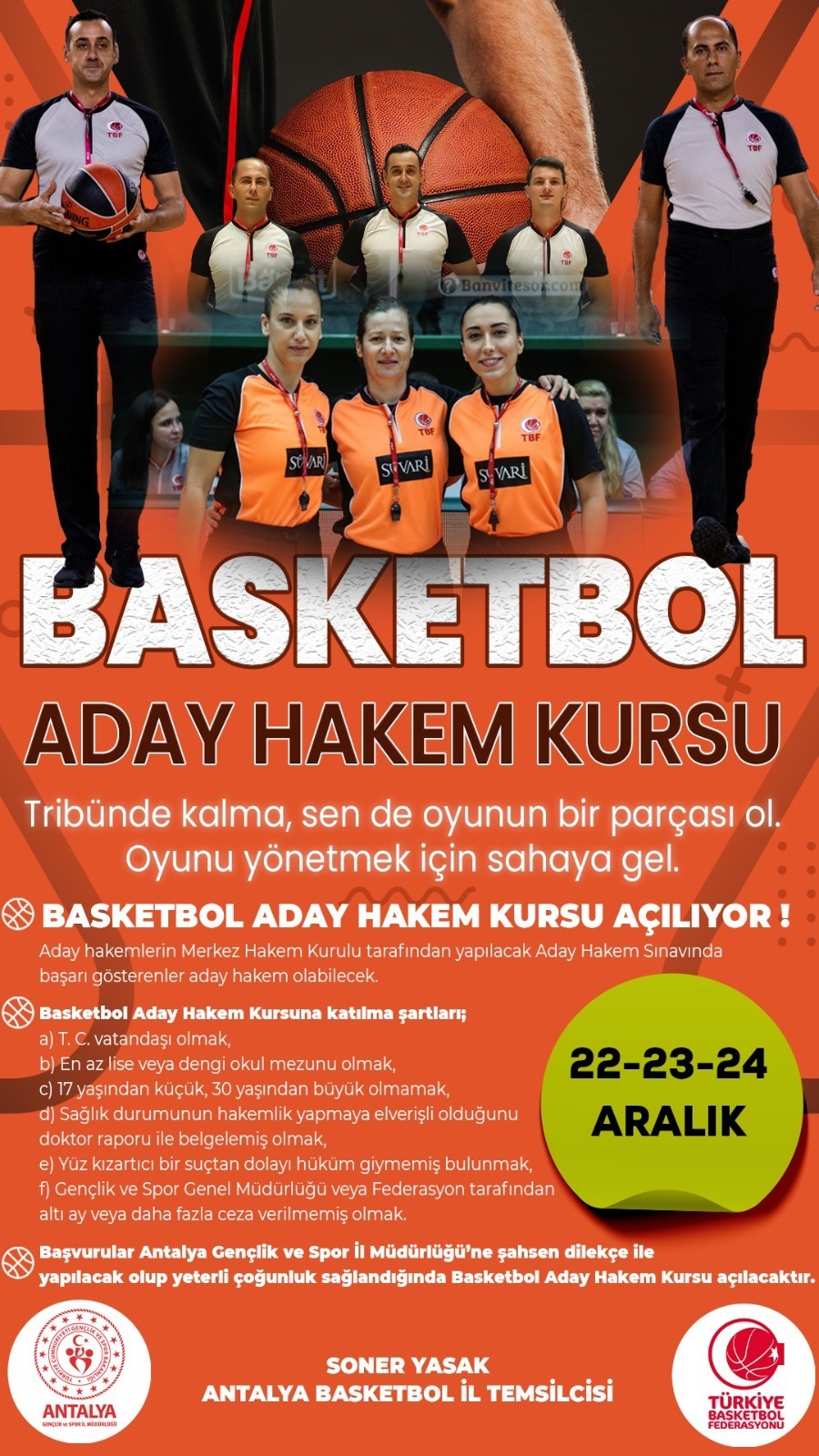 Antalya’da basketbolun bir parçası olmak isteyenlere önemli bir fırsat sunuluyor. Türkiye Basketbol Federasyonu ile Antalya Gençlik ve Spor İl Müdürlüğü iş birliğinde düzenlenen Basketbol Aday Hakem Kursu, 22–23–24 Aralık tarihlerinde gerçekleştirilecek.