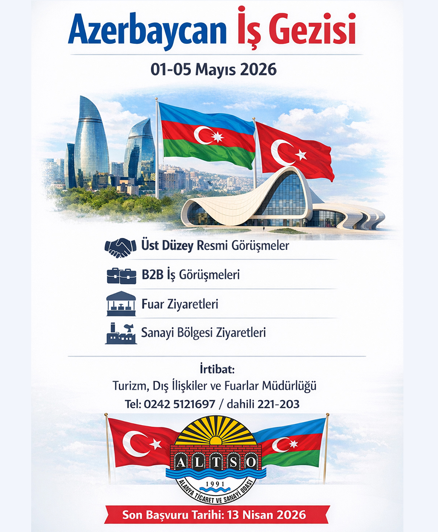 Alanya Ticaret ve Sanayi Odası Başkanı Eray Erdem, üyelerimizin uluslararası ticaret bağlantılarını güçlendirmesi ve Azerbaycan pazarıyla doğrudan temas kurması amacıyla 01-05 Mayıs 2026 tarihleri arasında Azerbaycan’a yönelik bir iş gezisi düzenleneceğini duyurdu.