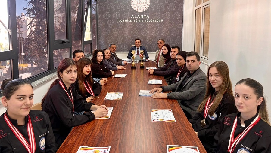 Alanya İlçe Milli Eğitim Müdürü Yusuf Yılmaz, ulusal yemek yarışmasında büyük başarı elde eden öğrencileri ve okul idaresini makamında kabul ederek madalya ve hediyelerini takdim etti.